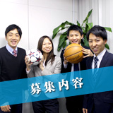 | 募集職種・分野 | ■総合職・一般職とも 1.スポーツイベント企画・運営 2.メディア企画・マーケティング・プロモーション 3.システムエンジニア 4.ウェブデザイナー・ディレクター ■一般職のみ 5.事務 |