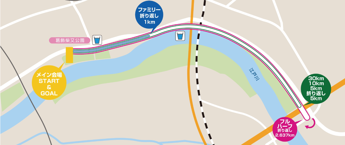 【ファミリーランの部】 :2kmのコースを1周【5kmの部】 :5kmのコースを1周【10㎞の部】 :10kmのコースを1周【ハーフマラソンの部】 :約10.548kmのコースを2周【30kmの部】 :10kmのコースを3周【フルマラソンの部】 :約10.548kmのコースを4周